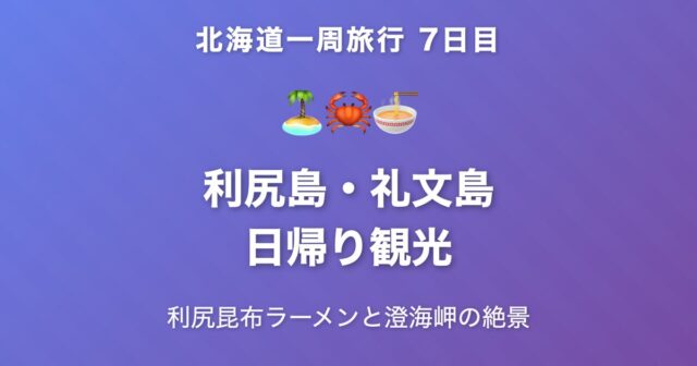 北海道一周 【北海道一周旅行7日目】利尻島・礼文島日帰り観光!利尻昆布ラーメンと澄海岬の絶景 2025年12月16日 須崎 純一 北海道一周旅行7日目。稚内からフェリーで利尻島へ日帰り観光に行ってきました! 利尻昆布ラーメン、澄海岬の絶景、そして夜は稚内で海鮮三昧 …