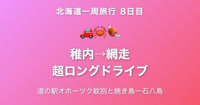 北海道一周 【北海道一周旅行8日目】稚内→網走 超ロングドライブ!道の駅オホーツク紋別と焼き鳥一石八鳥 2025年12月16日 須崎 純一 北海道一周旅行8日目。稚内から網走まで、約400kmの超ロングドライブの日なんです! オホーツク海沿いを南下して、道の駅オホーツク紋別でカニ …
